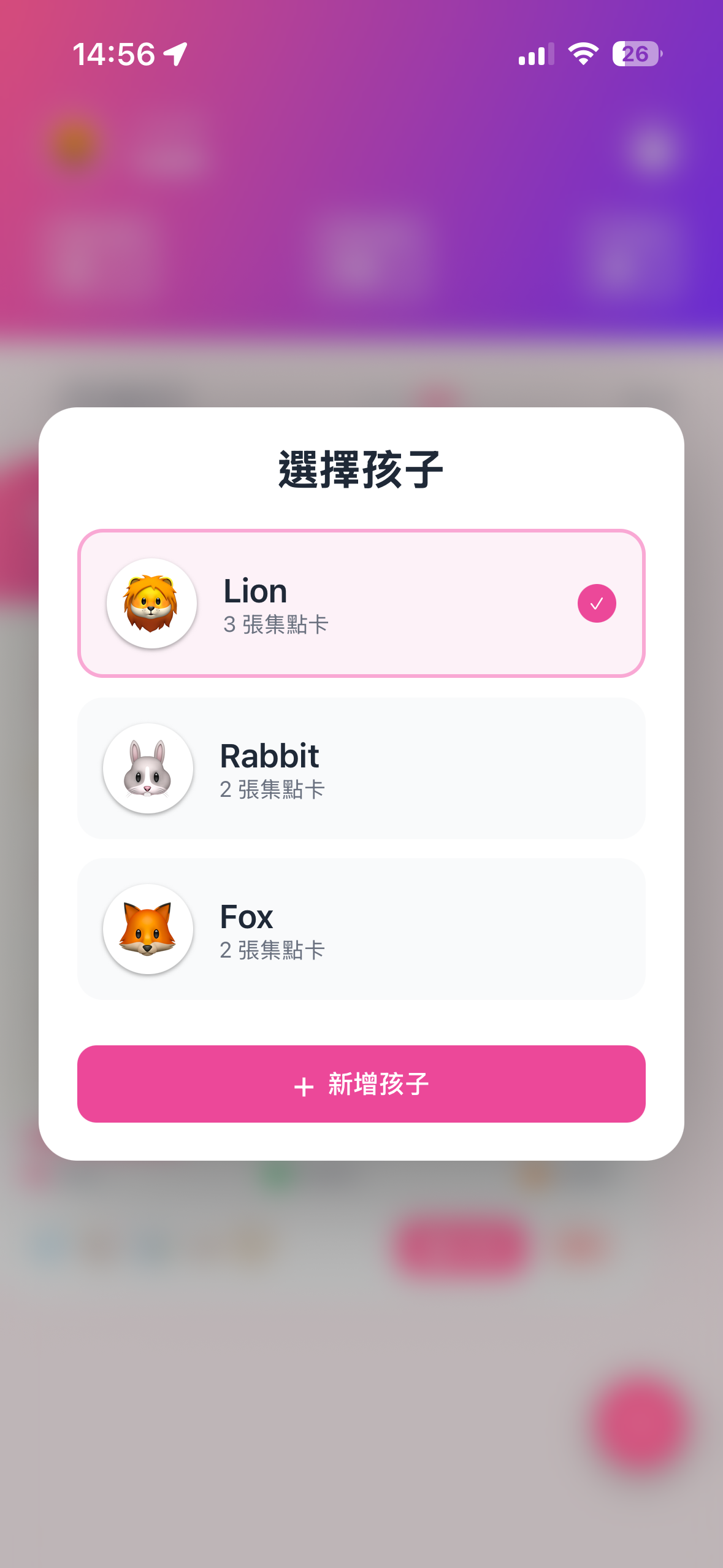 獅子是哥哥,兔子是妹妹。一鍵切換不同孩子的集點卡,進度獨立計算,公平又方便。