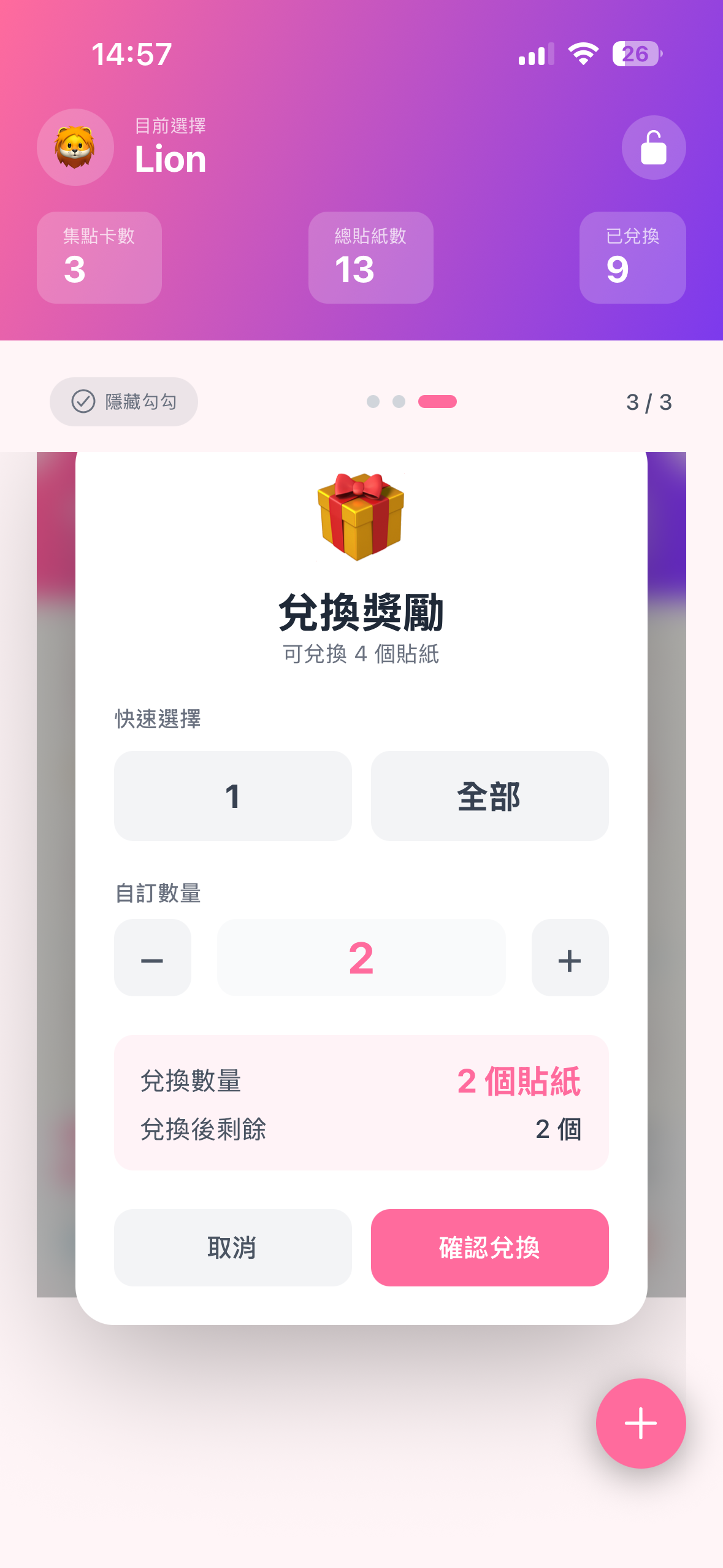 獅子是哥哥,兔子是妹妹。一鍵切換不同孩子的集點卡,進度獨立計算,公平又方便。